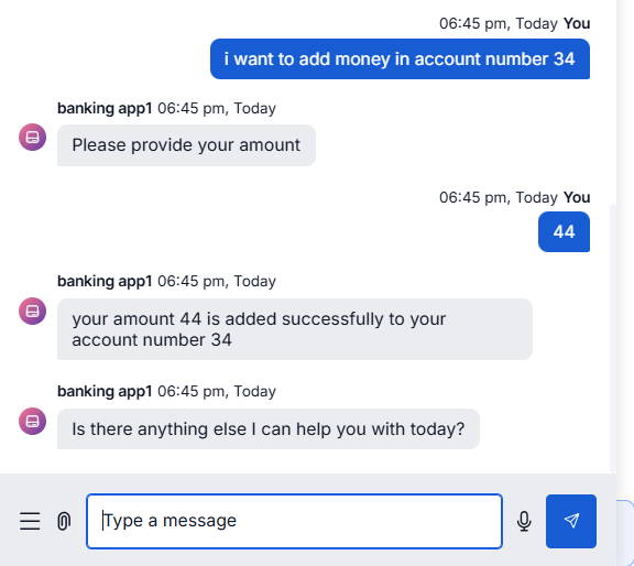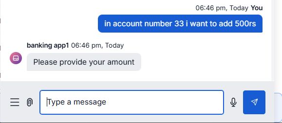 I have created a sample dialog task where I ask the user to provide the account number and the amount to be credited to a bank account. The first entity is accountNumber, and the second entity is amount in the dialog flow.