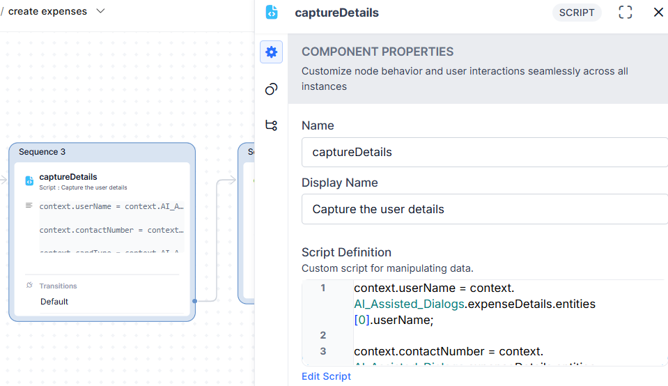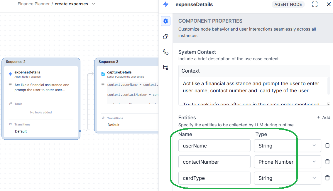 - Create an agent node, and here you can collect some details(along with field datatype) from the end user, as shown in the screenshot below.