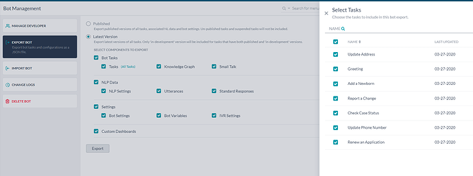 A bot is set of tasks so inherently you will export all the tasks when exporting a bot. It is also possible to choose which tasks you want to export in the bot.