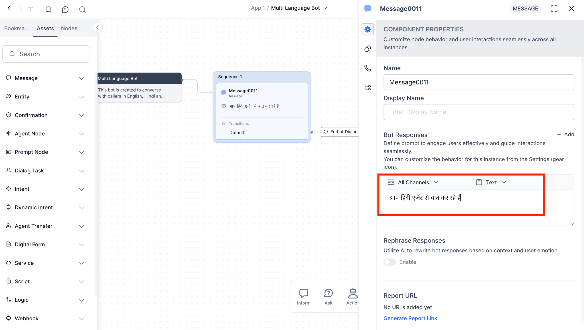 - For each node (like a Message node or Entity node), enter the text in the selected language.Example: For a Message node, if you’ve selected Hindi, you’ll enter the Hindi text in the “Bot Response” box.
