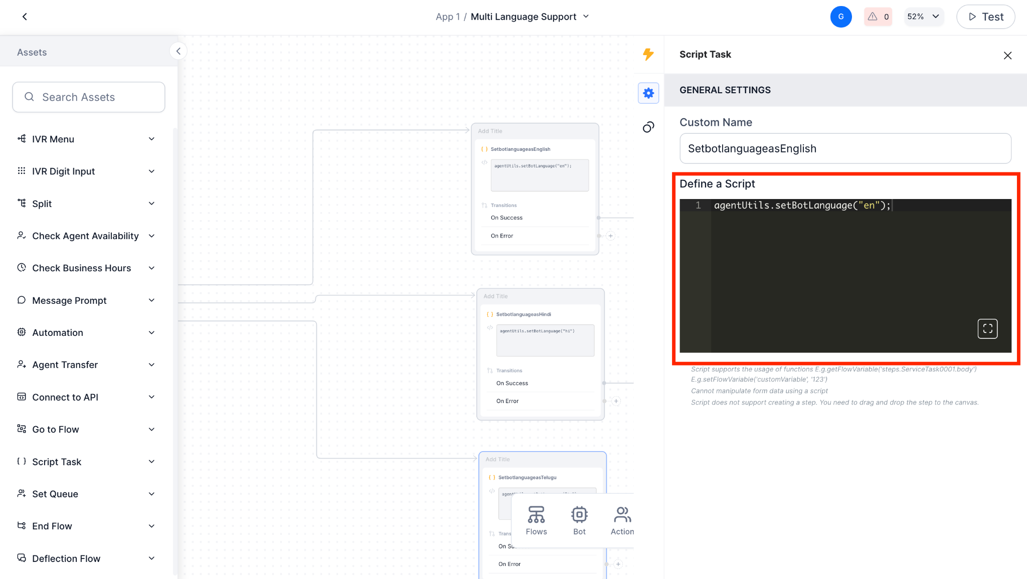 - In the IVR Menu node, create prompts for each language option (for example, “Press 1 for English,” “Press 2 for Hindi,” “Press 3 for Telugu”).